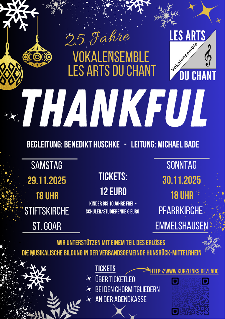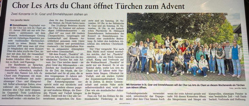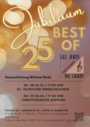 Unser Jubiläumsjahr 2025 war für uns etwas ganz Besonderes. Wir feierten mit zwei Best-Of-Konzerten am 28. und 29.06., einem Chorausflug mit anschließendem internen Jubiläumsfest und zwei Best-Of-Christmas-Konzerten "Thankful" am 29. und 30.11. Hier gibt eine Sammlung aller Infos.